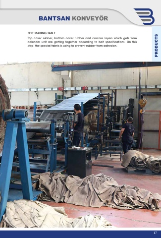 BELT MAKING TABLE PRODUCTS Top cover rubber, bottom cover rubber and carcass layers which gets from calender unit are getting together according to belt specifications. On this step, the special fabric is using to prevent rubber from adhesion. 17
